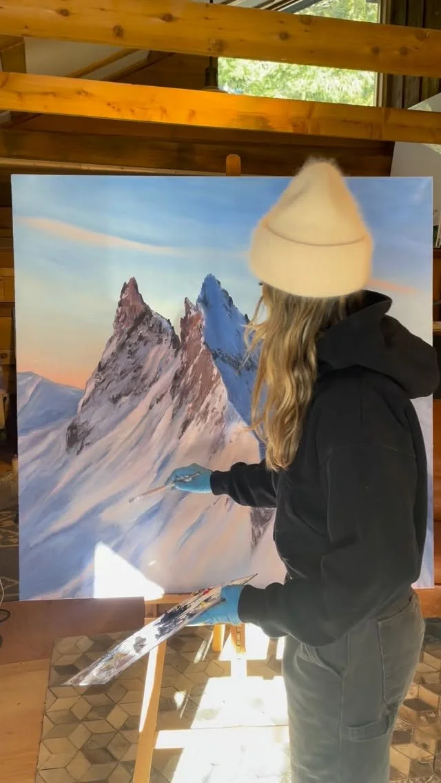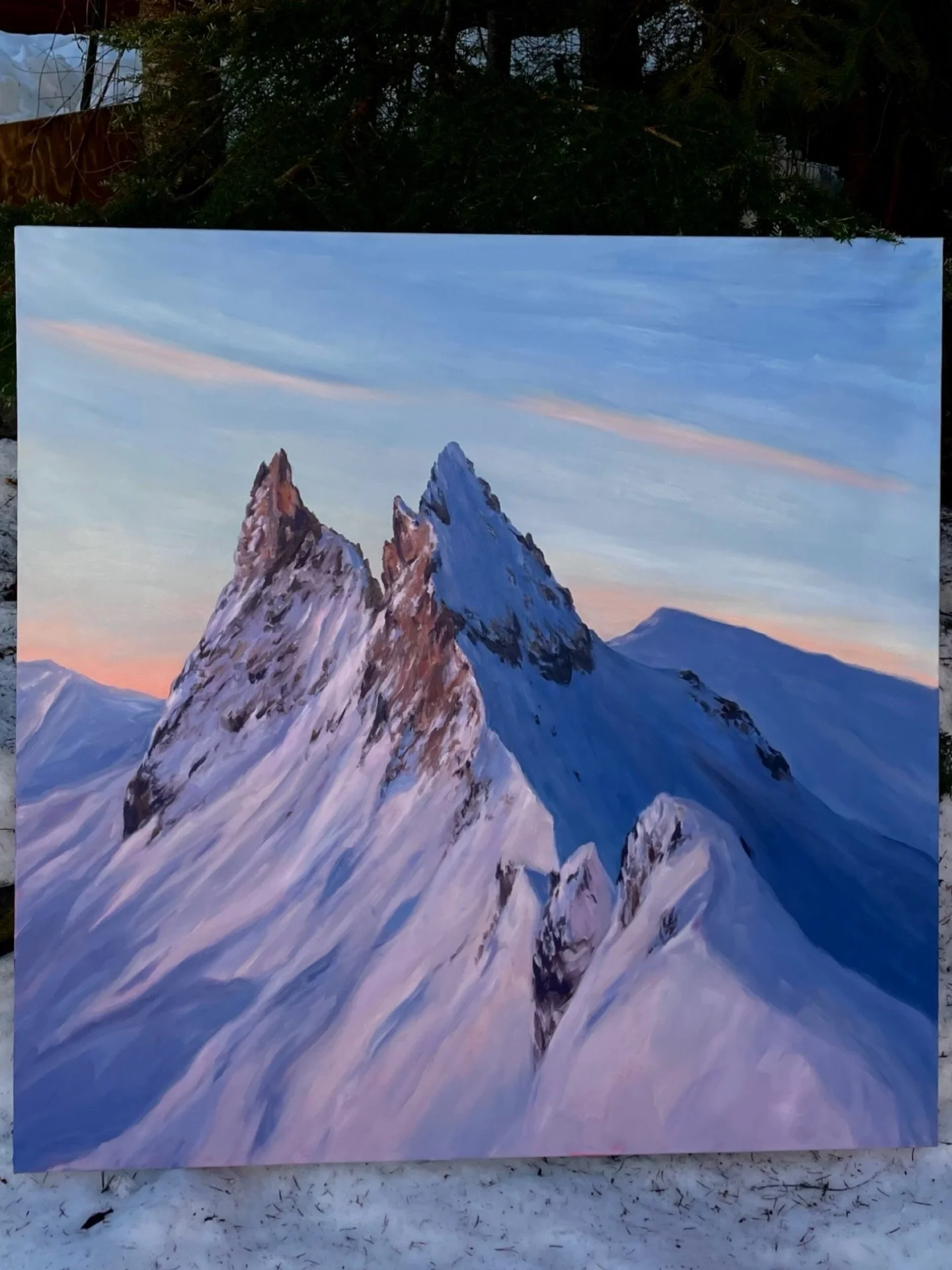 Her artistic journey shifted profoundly after moving from her home in Ontario to British Columbia, where she discovered an undeniable connection to the mountains; and with it, a new focus for her work. Drawn to Whistler by the beauty of its landscapes, Cass found herself captivated by the endless inspiration around her. Today, she works primarily in oils, using her paintbrush to reflect the incredible landscapes she sees every day. Whether hiking, biking, skiing, camping, or simply sitting by a river, she gathers her ideas directly from the natural world. Since settling in Whistler in 2022, she has been devoted to creating landscape paintings that celebrate the mountains and valleys that captured her heart.
