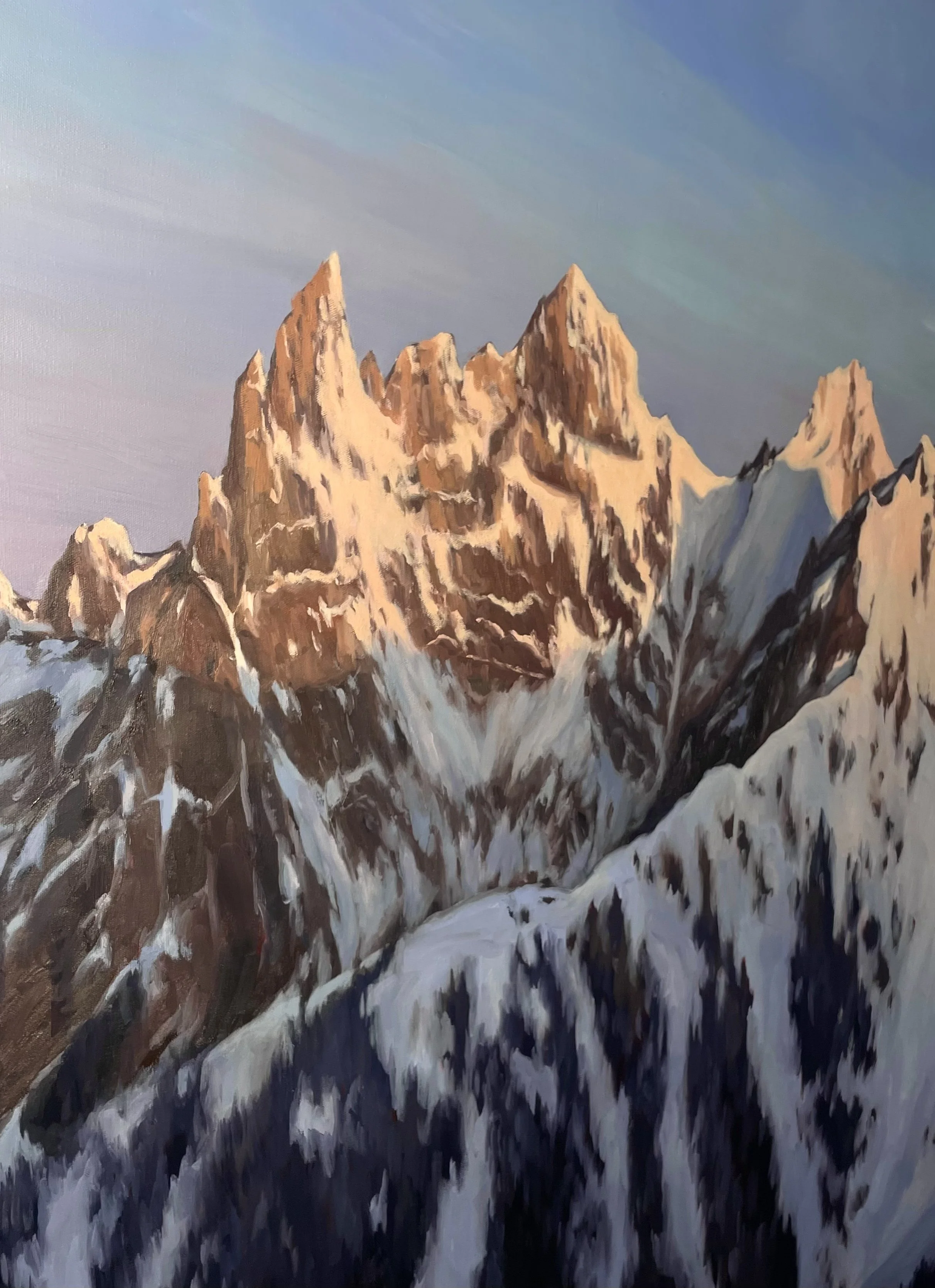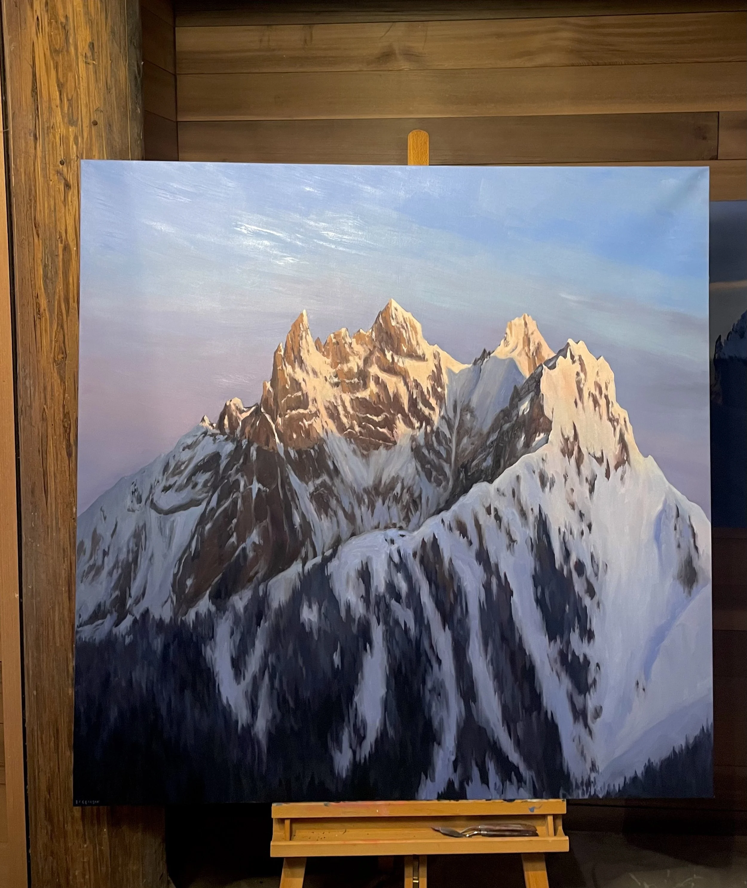This mountain range, the Garibaldi Ranges, have inspired me endlessly. I wanted to paint the feeling of being on top of the world when the sun greets the mountain tops good morning. Standing there, you feel wonderfully insignificant and connected with Mother Nature. The moments I’ve spent looking out to this view will stay with me for a lifetime.