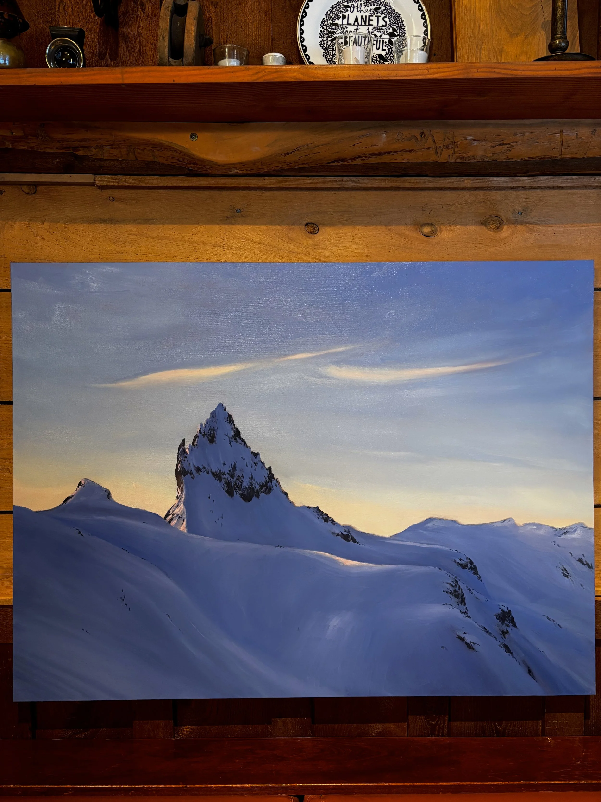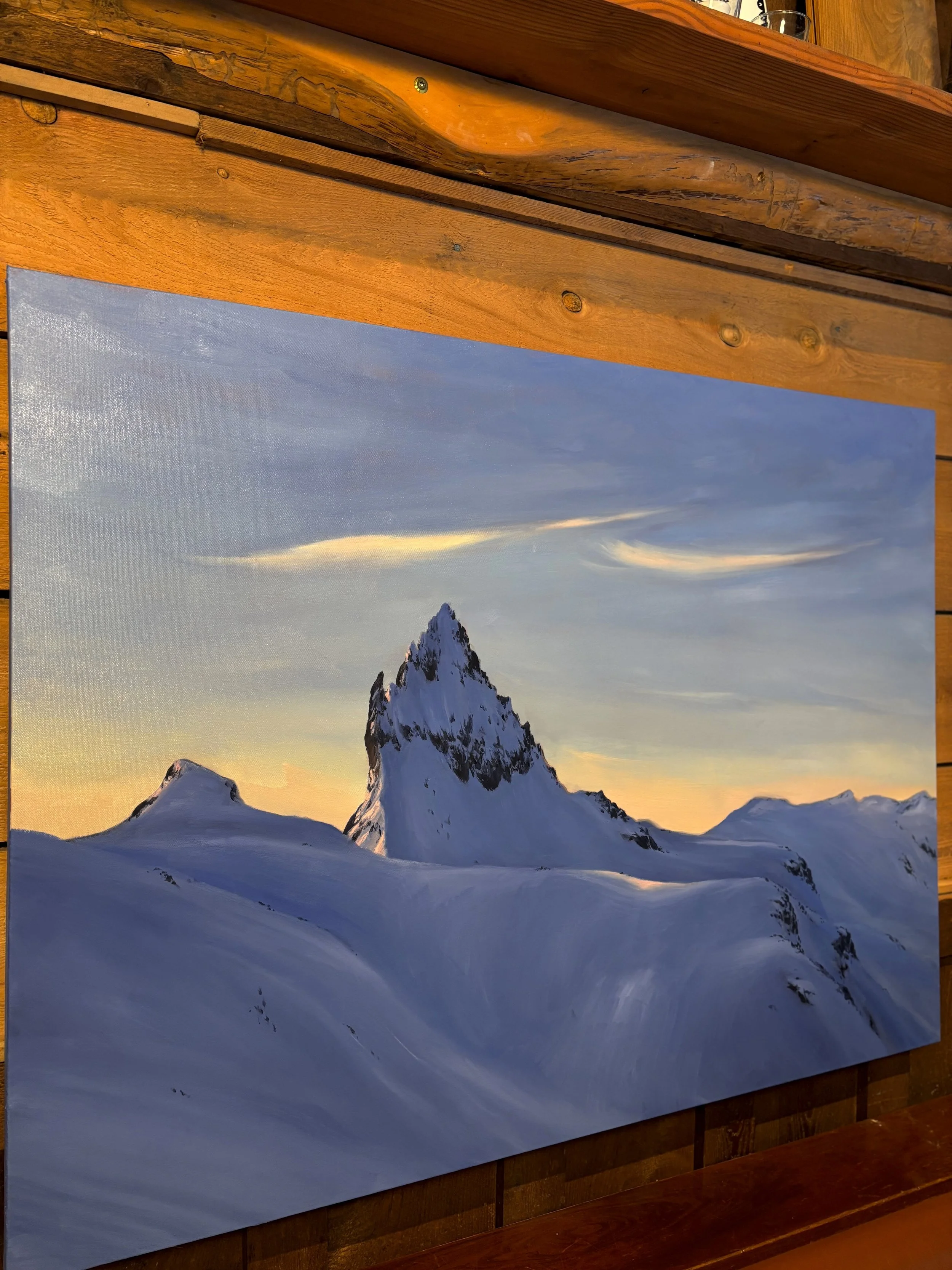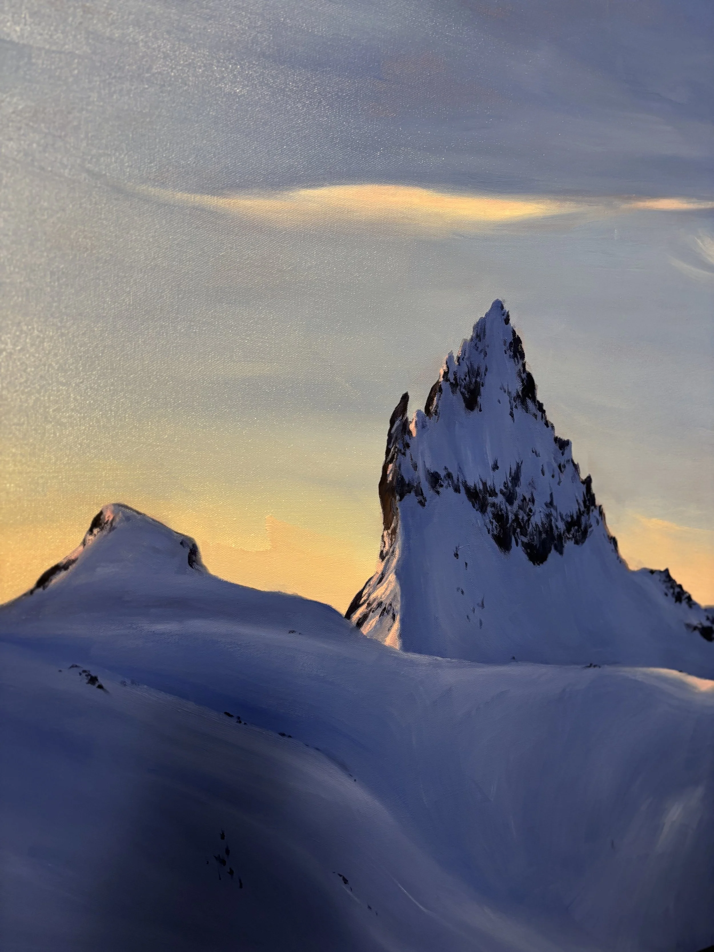 Mount Fee towers above the Garibaldi Ranges of the Coast Mountains. With this painting, I wanted to capture the fleeting colours of sunrise that momentarily illuminate the volcanic peaks. Contrasted by the deep blues of the mountain, which invite the crisp morning air in the alpine.