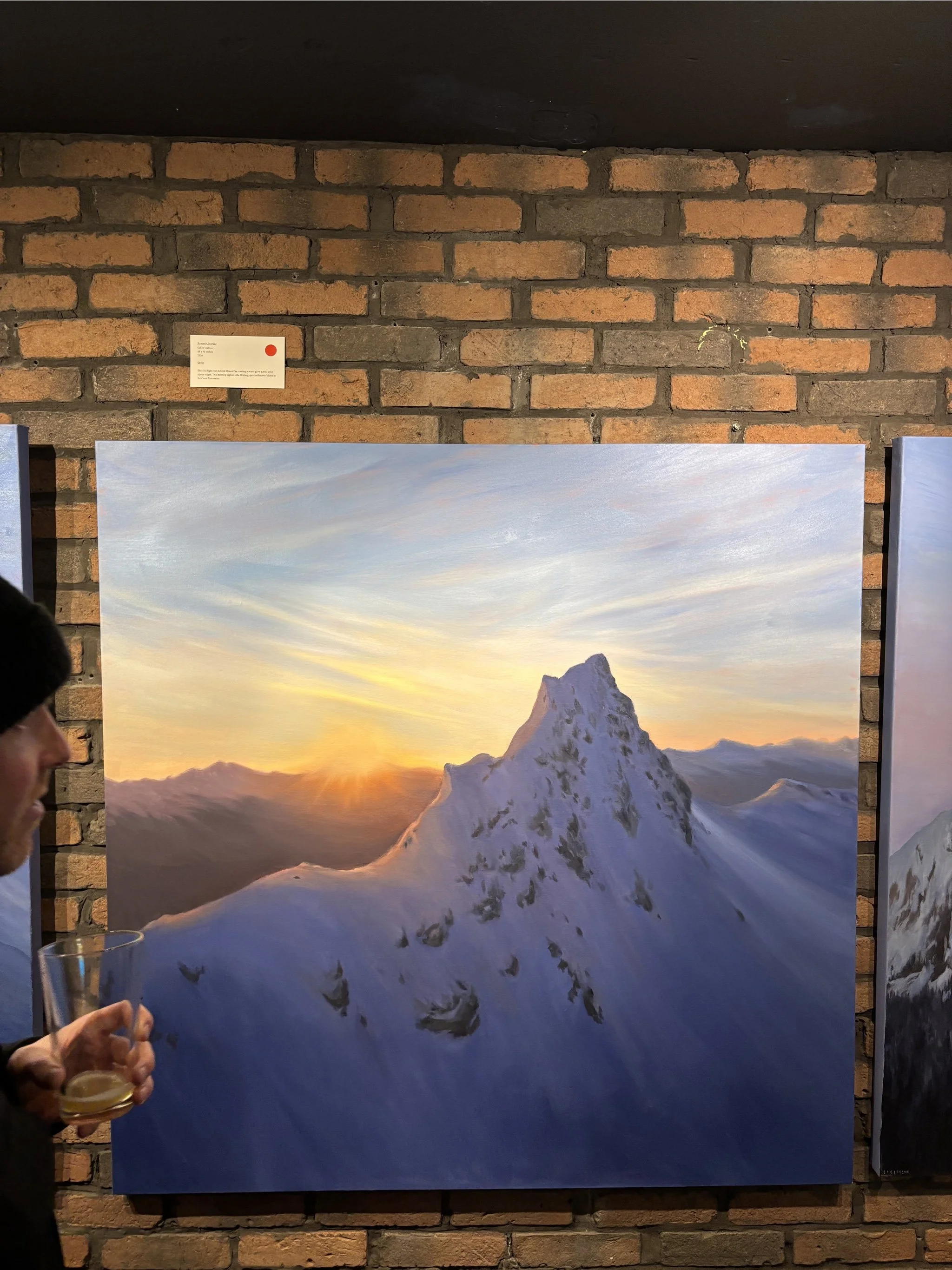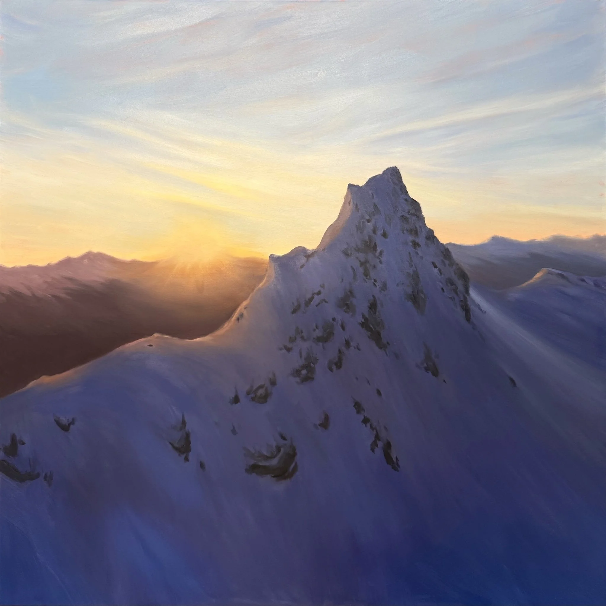 The first light rises behind Mount Fee, casting a warm glow across cold alpine ridges. This painting captures the fleeting, quiet stillness of dawn in the Coast Mountains.